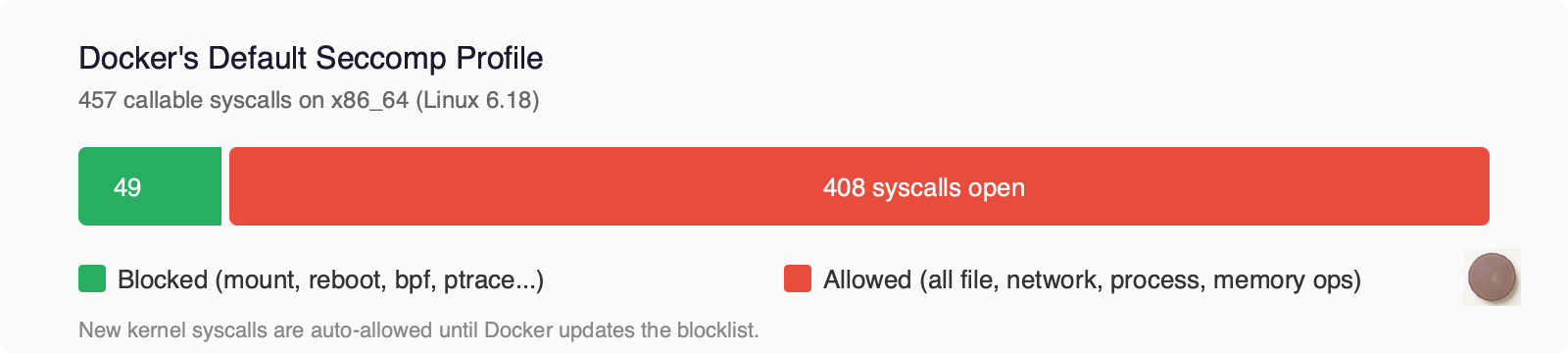 Docker’s default seccomp profile is technically a blocklist. The default action is SCMP_ACT_ALLOW, and the profile defines about 49 syscalls to block. Everything not on the blocklist is permitted. Out of 457 callable syscalls, that leaves over 400 open.
