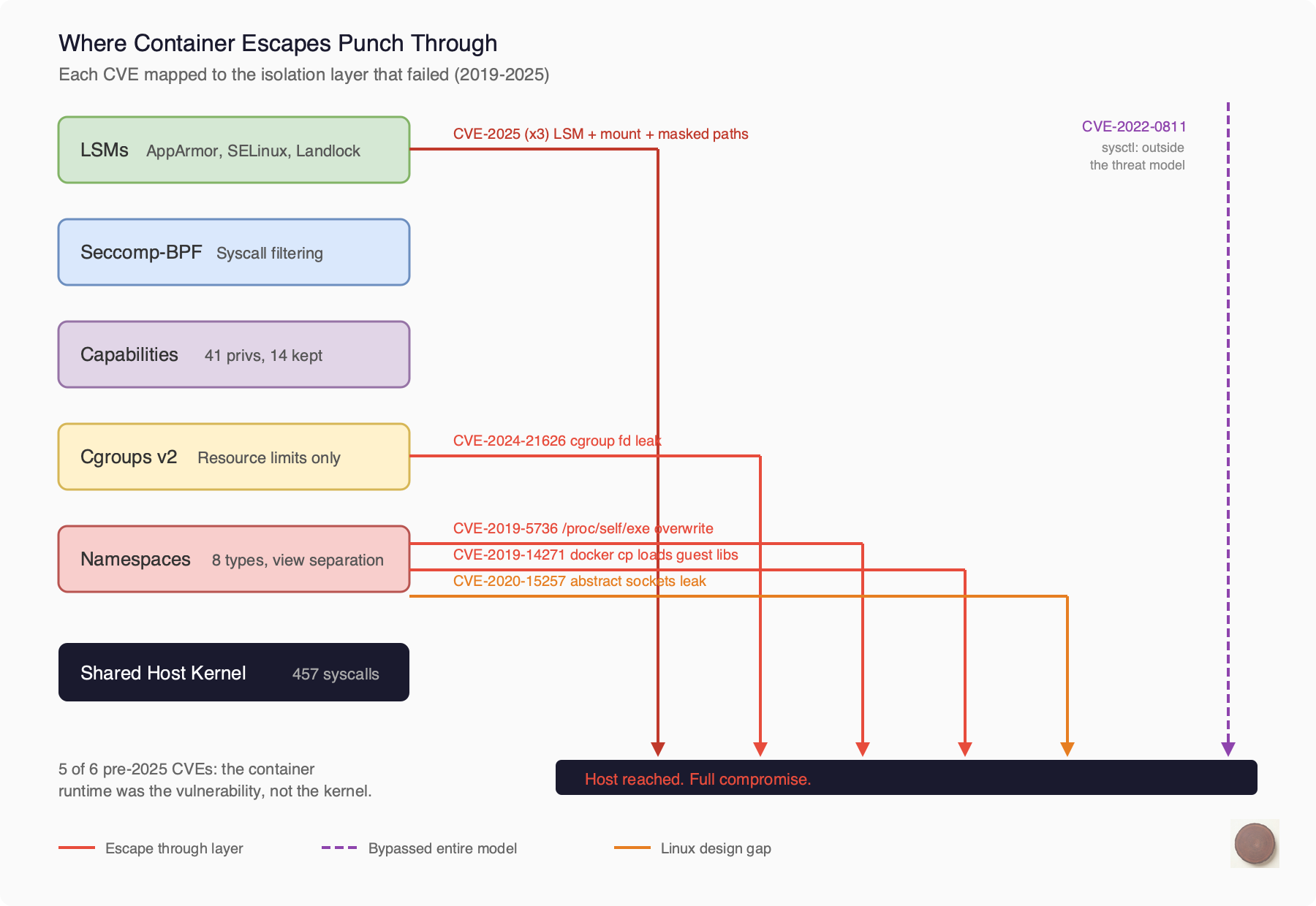 The point isn’t the dates. The point is that containers are six independent mechanisms bolted together over twenty years. No single designer. No unified threat model. No guarantee that the gaps between mechanisms are covered.